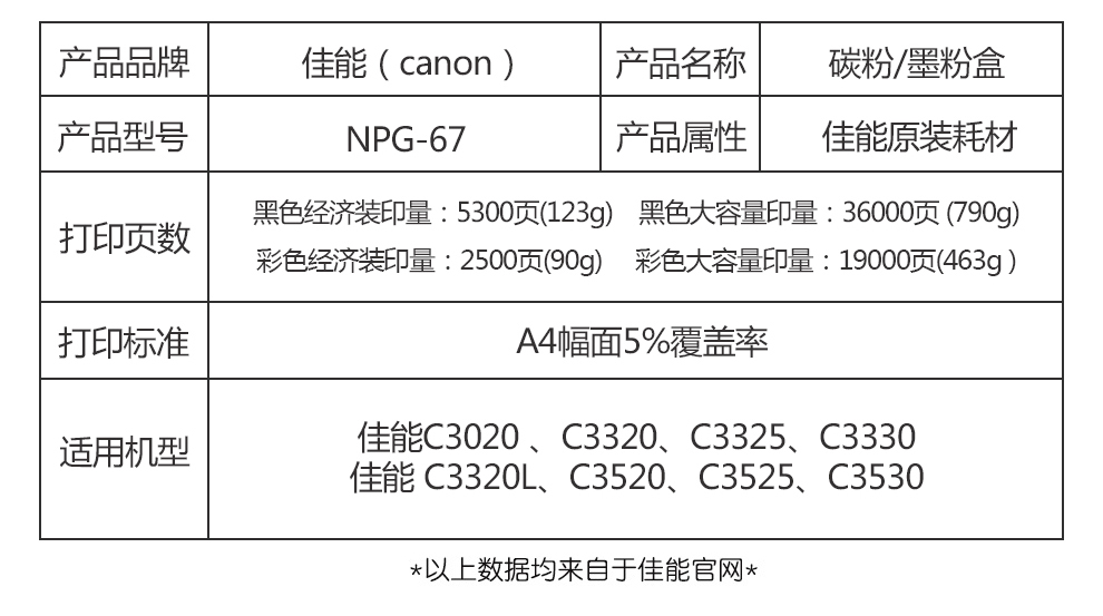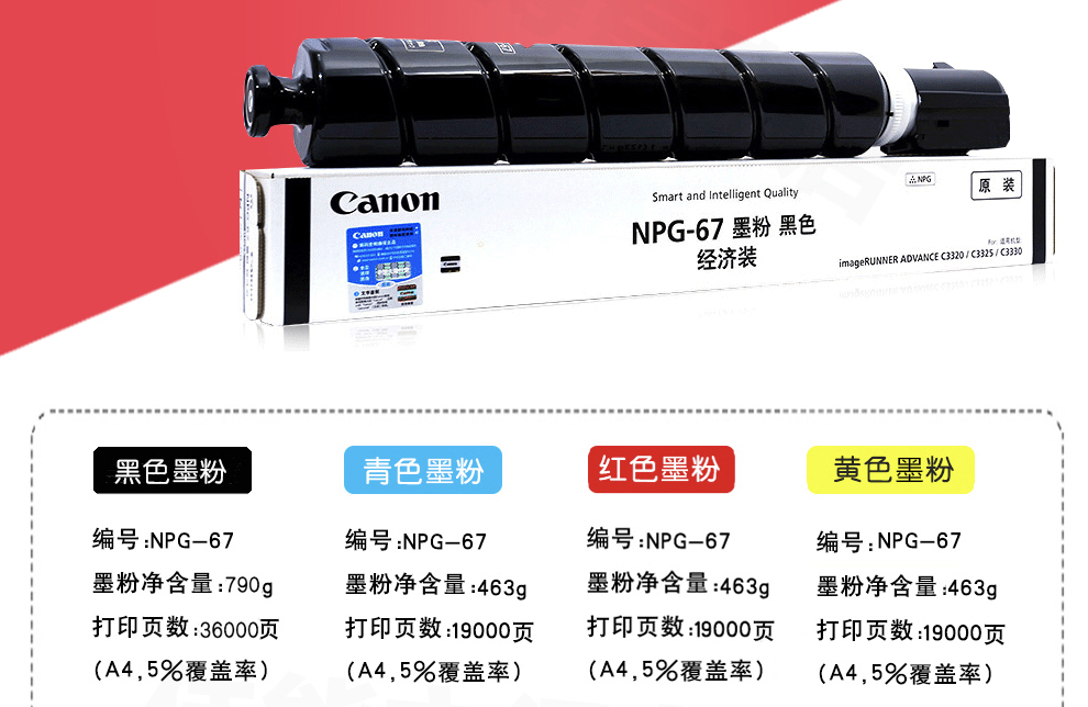 • 商品名稱:佳能(Canon)復合機NPG-67BK原裝黑色大容量墨粉(iR-ADV C3520/3525/3530/3320/3320L/3325/3330,C3020)