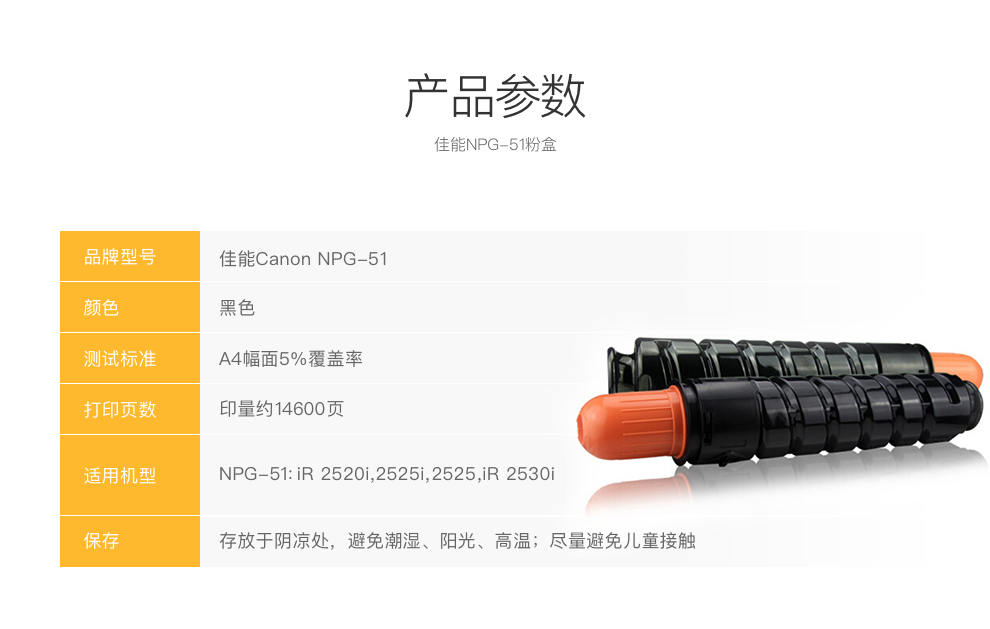 • 商品名稱:佳能(Canon)NPG-51原裝黑色墨粉盒(適用復合機iR 2520i 2525i 2530i )