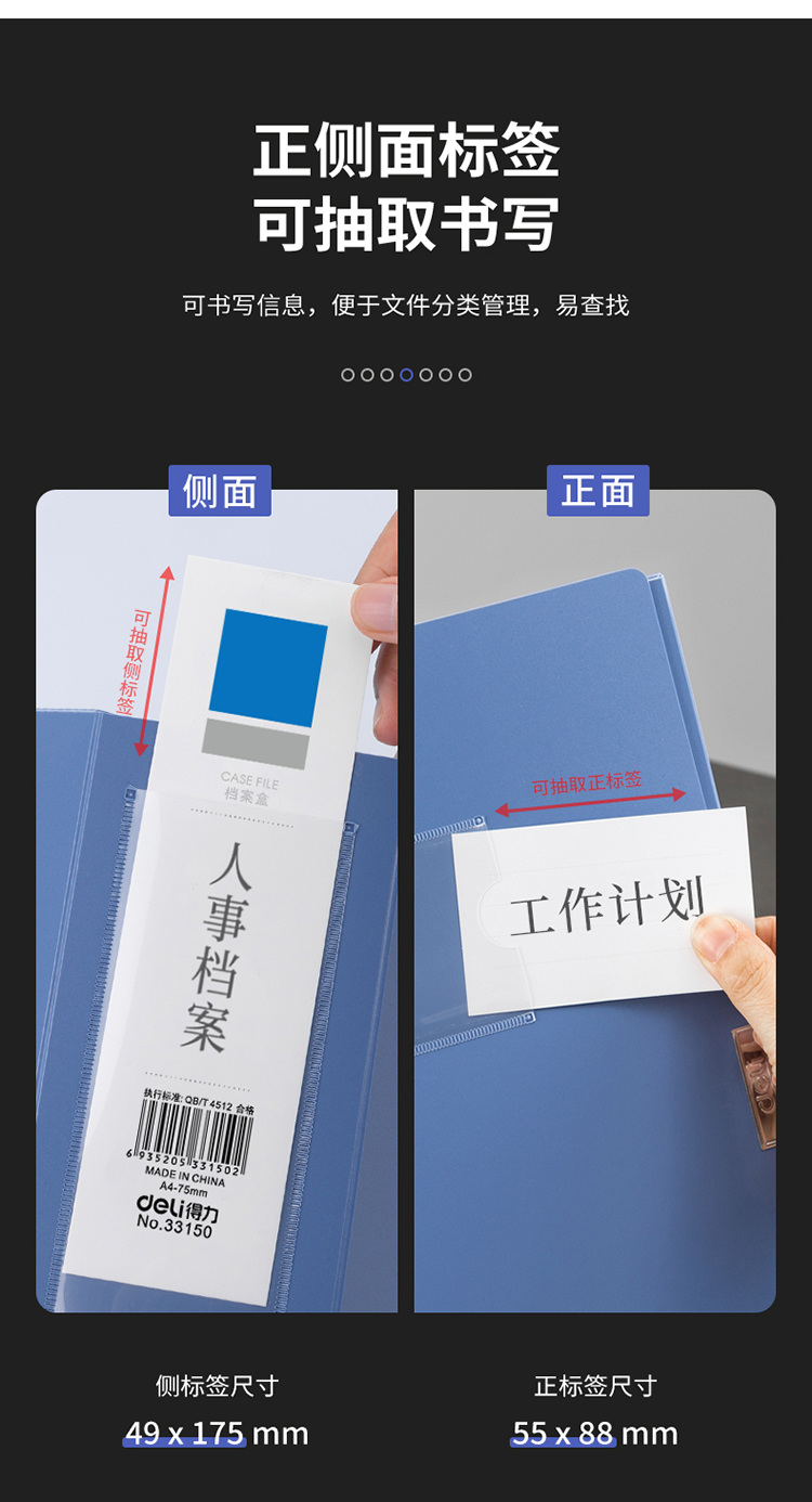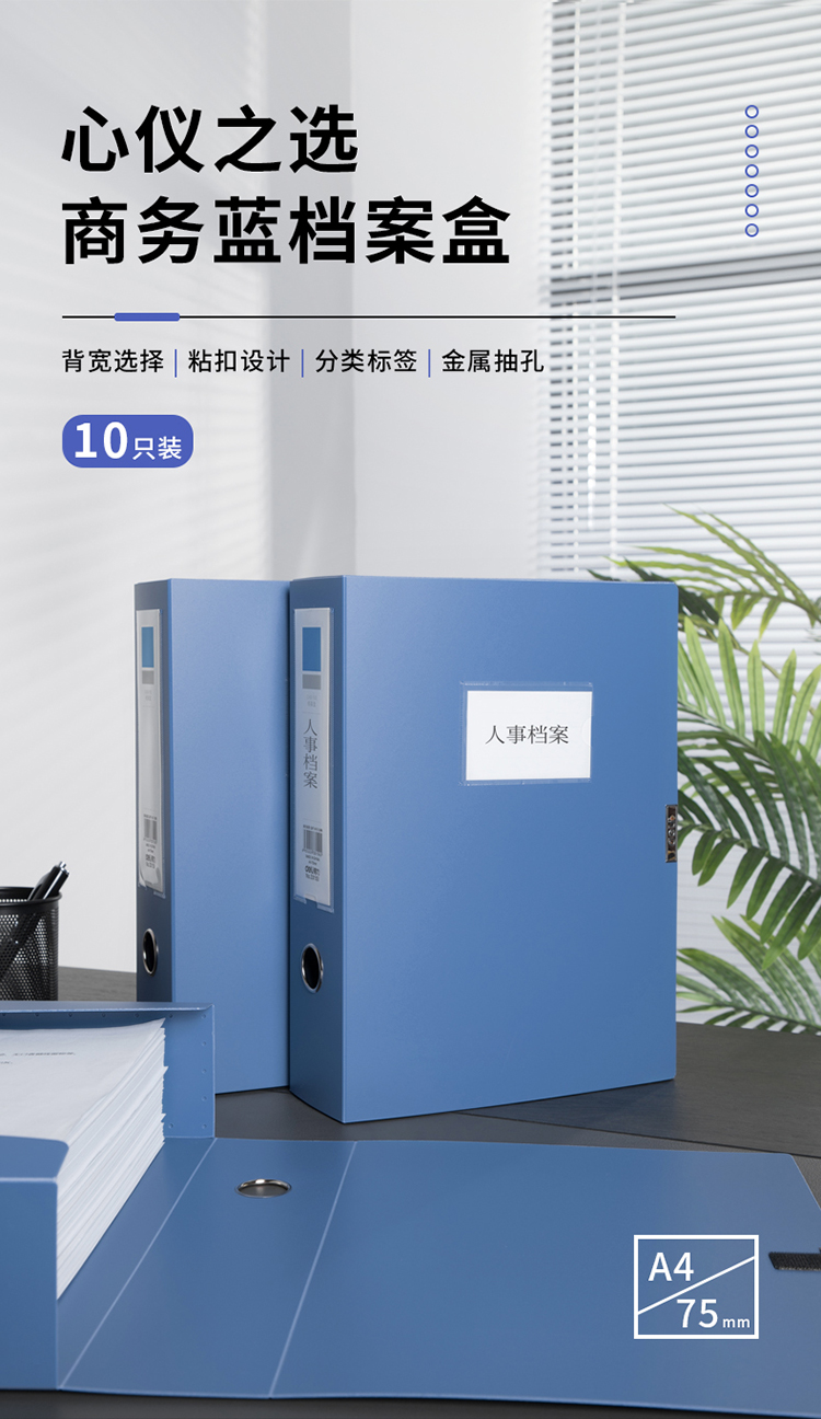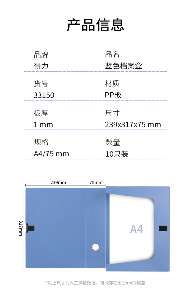 • 商品名稱:得力(deli)10只 75mm耐用粘扣檔案盒 A4文件盒資料盒 藍(lán)33150