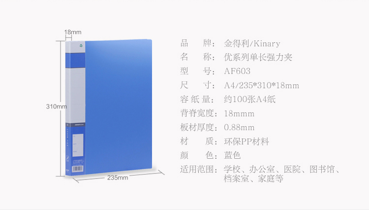 • 商品名稱:金得利(KINARY) AF603 A4單強(qiáng)力長(zhǎng)押文件夾 藍(lán)色