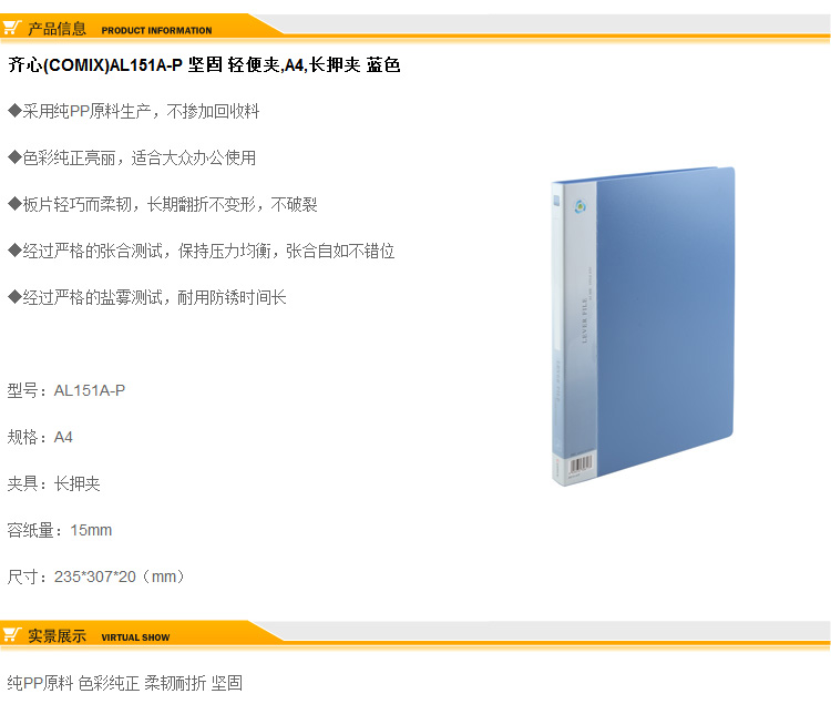 • 商品名稱:齊心(Comix) AL151A-P 堅(jiān)固文件夾/資料夾/長(zhǎng)押夾A4 藍(lán)色