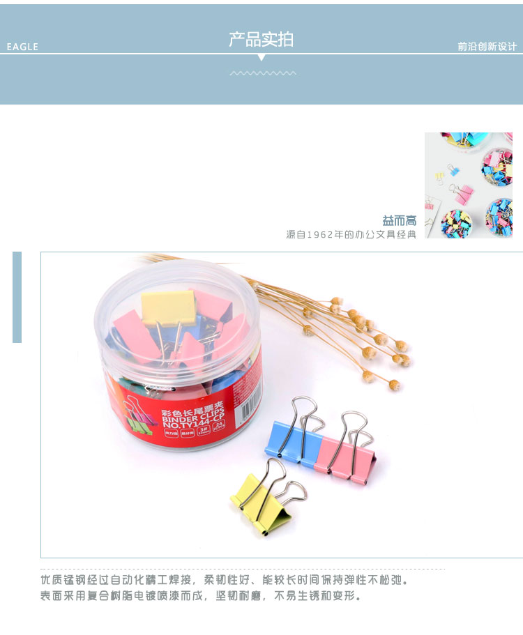 • 商品名稱:益而高(EAGLE)24只裝32mm彩色長尾夾 中號燕尾夾子金屬文件夾票據(jù)夾辦公文具 1桶裝 TY144-CP