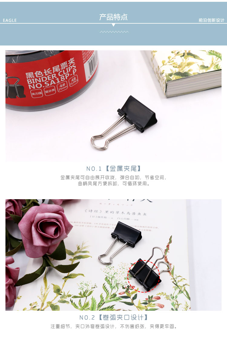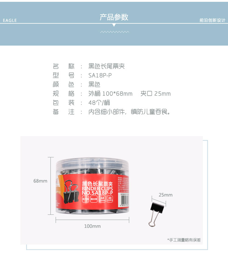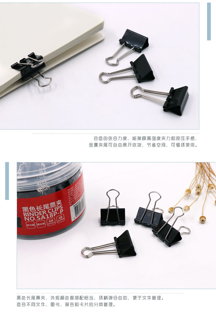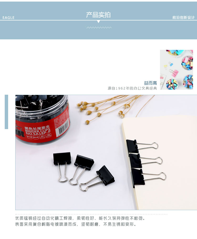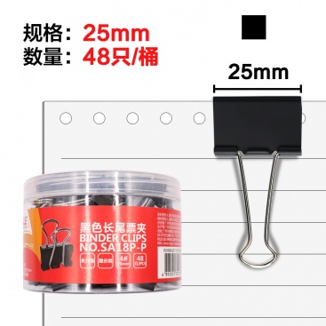 • 商品名稱:益而高(EAGLE)48只裝25mm黑色長尾夾 中號燕尾夾子金屬文件夾票據(jù)夾辦公文具 1桶裝 SA18P-P