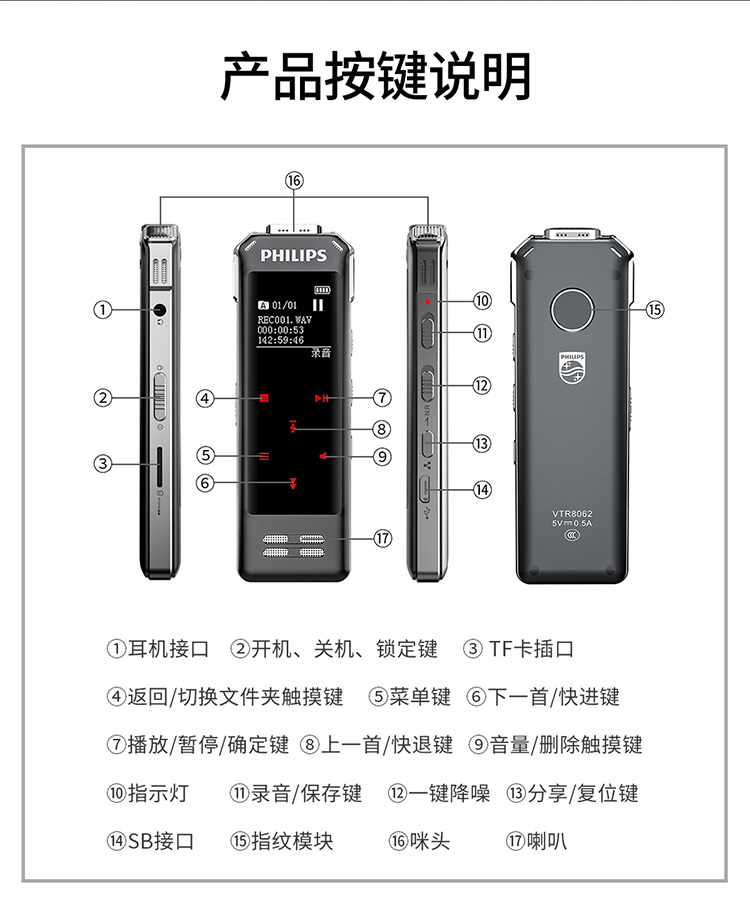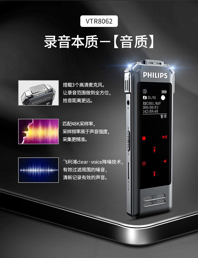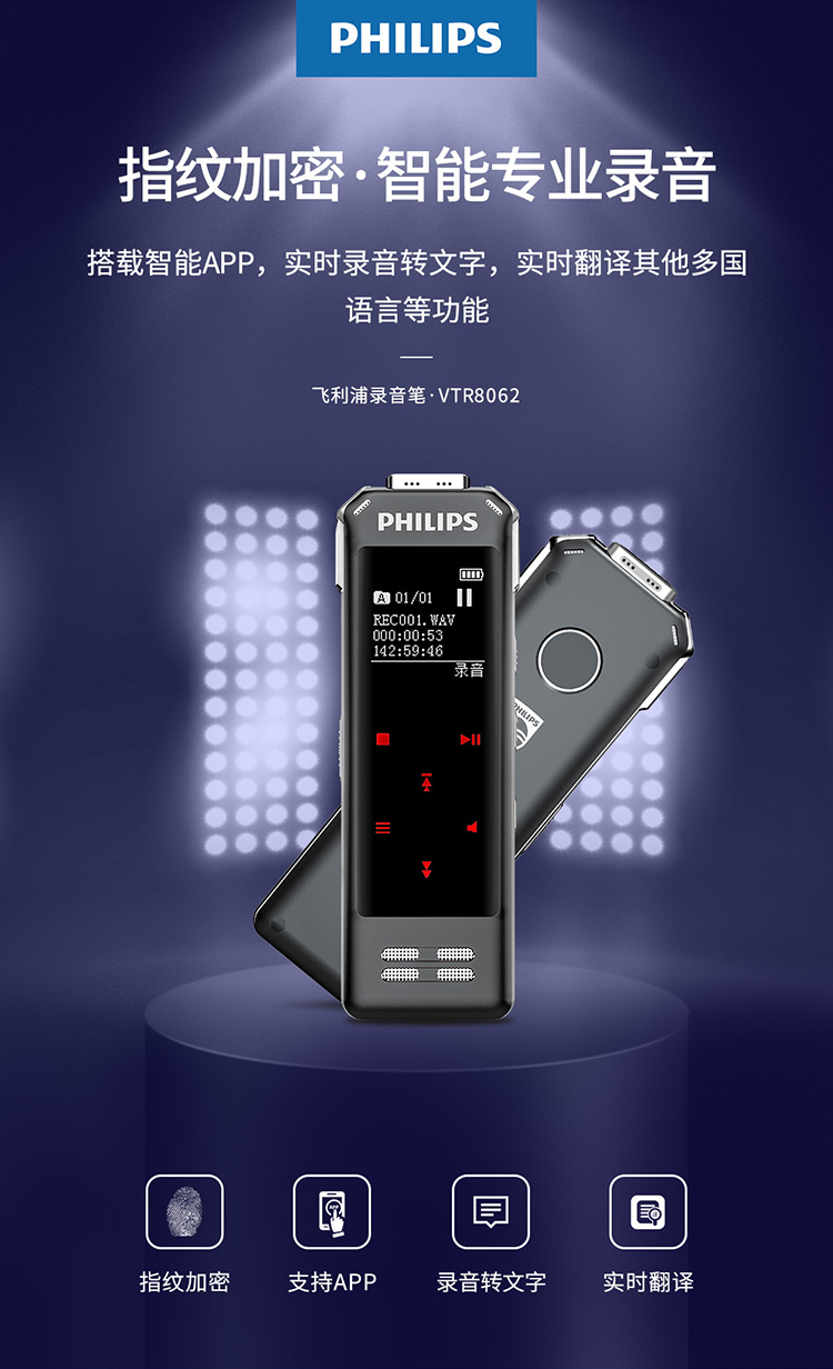 • 商品名稱:飛利浦(PHILIPS)VTR8062 16G 指紋加密 APP智能專業(yè)錄音筆 實(shí)時翻譯 語音轉(zhuǎn)文字