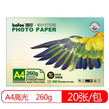 • 商品名稱:得印(befon)A4 高光面照片紙 RC防水速干 260g 噴墨打印機照片相紙 20張/包 彩色打印相片紙