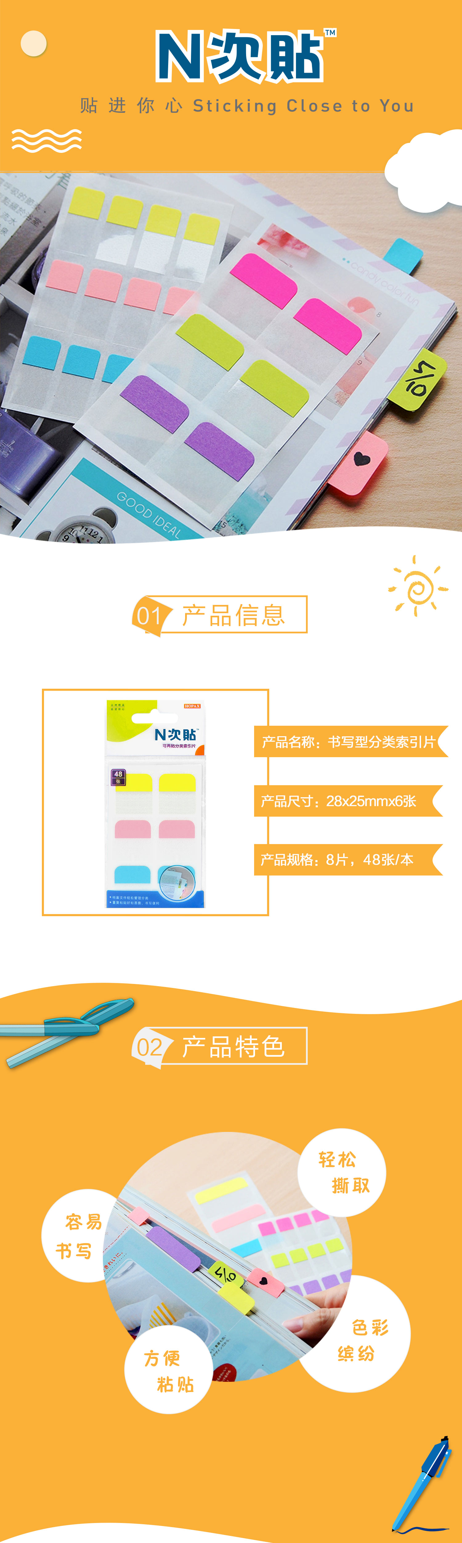 • 商品名稱:N次貼(STICKN)熒光指示標簽貼分類便簽紙便利貼索引片25*28mm 紙標頭易書寫48枚3色34044
