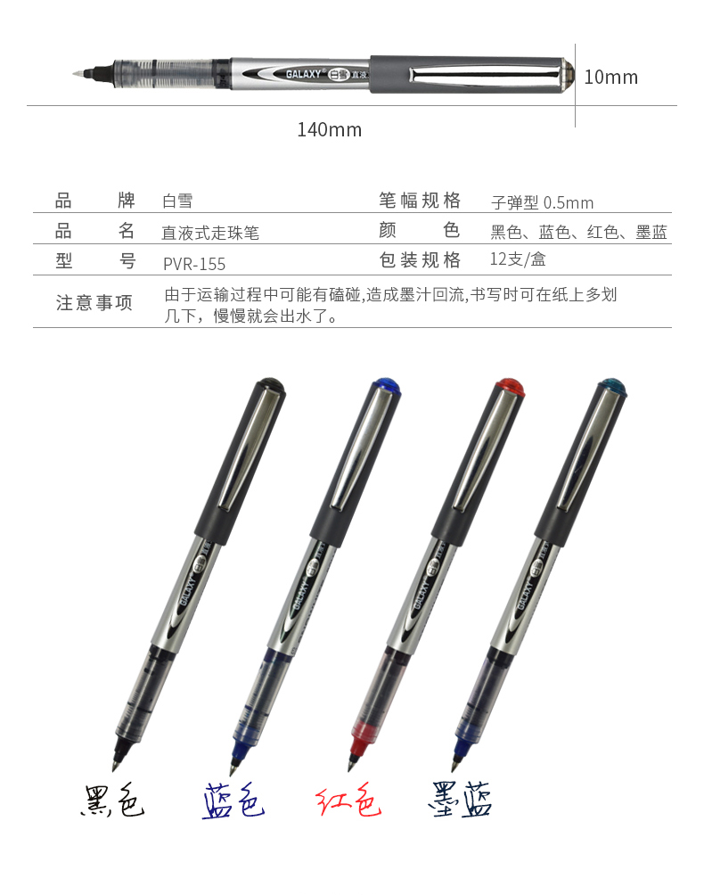 • 商品名稱:白雪(snowhite)直液式走珠筆子彈型0.5mm中性筆PVR-155黑色 12支/盒