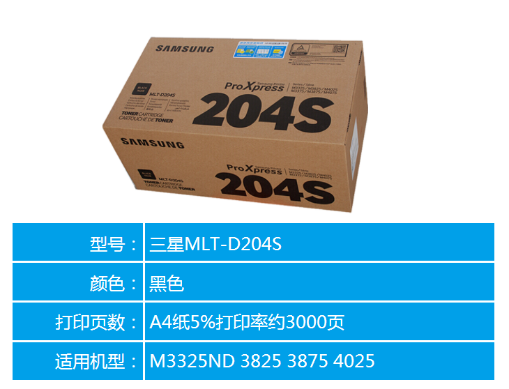 • 商品名稱:三星原裝MLT-D204S粉盒204硒鼓適用于 M3325ND 3825 3875 4025 MTL D204S標準容量粉盒(約3000頁)