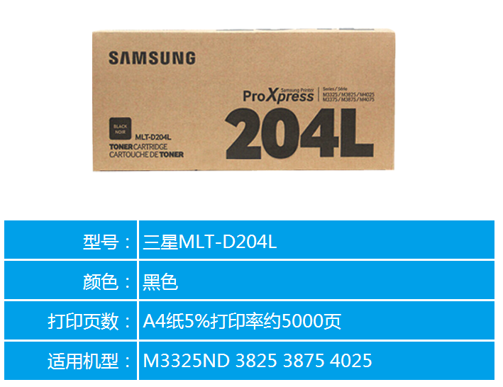 • 商品名稱:三星原裝MLT-D204S粉盒204硒鼓適用于 M3325ND 3825 3875 4025 MTL D204L大容量粉盒(約5000頁)