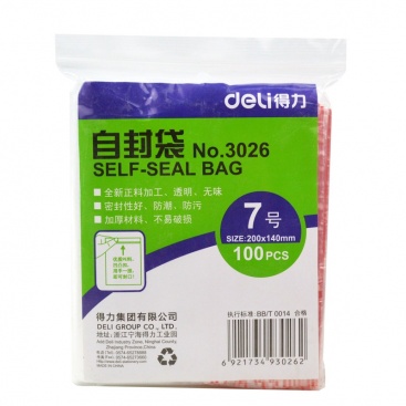 • 商品名稱:得力(deli)自封袋 塑封袋子加厚密封包裝袋 透明封口袋 100個(gè)/包 7號(hào)(20*14cm)3026