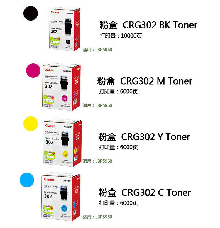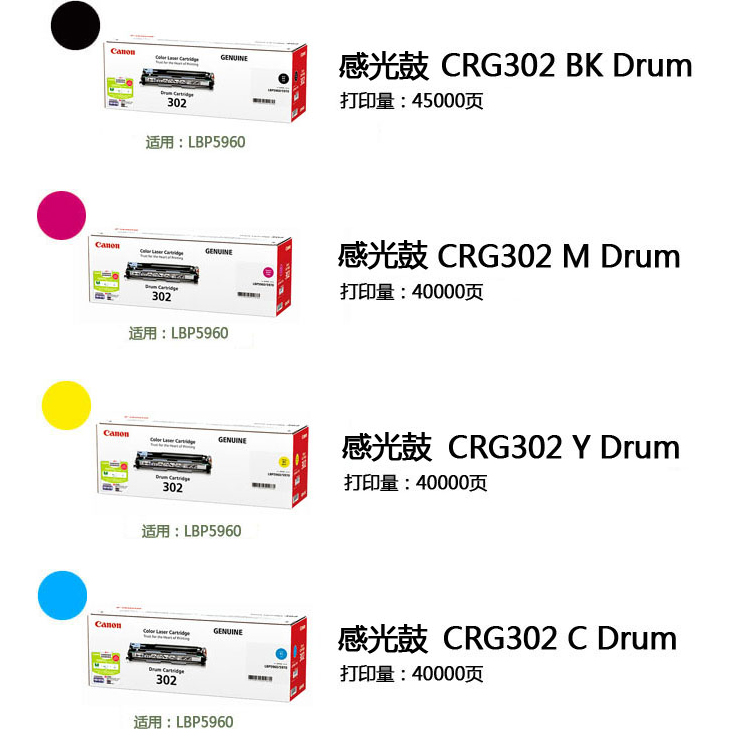 • 商品名稱:佳能原裝CRG302 黑彩硒鼓墨粉/廢粉倉(cāng) 適用于LBP5960 佳能打印機(jī)使用 CRG302 四色墨粉一套