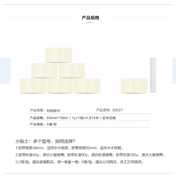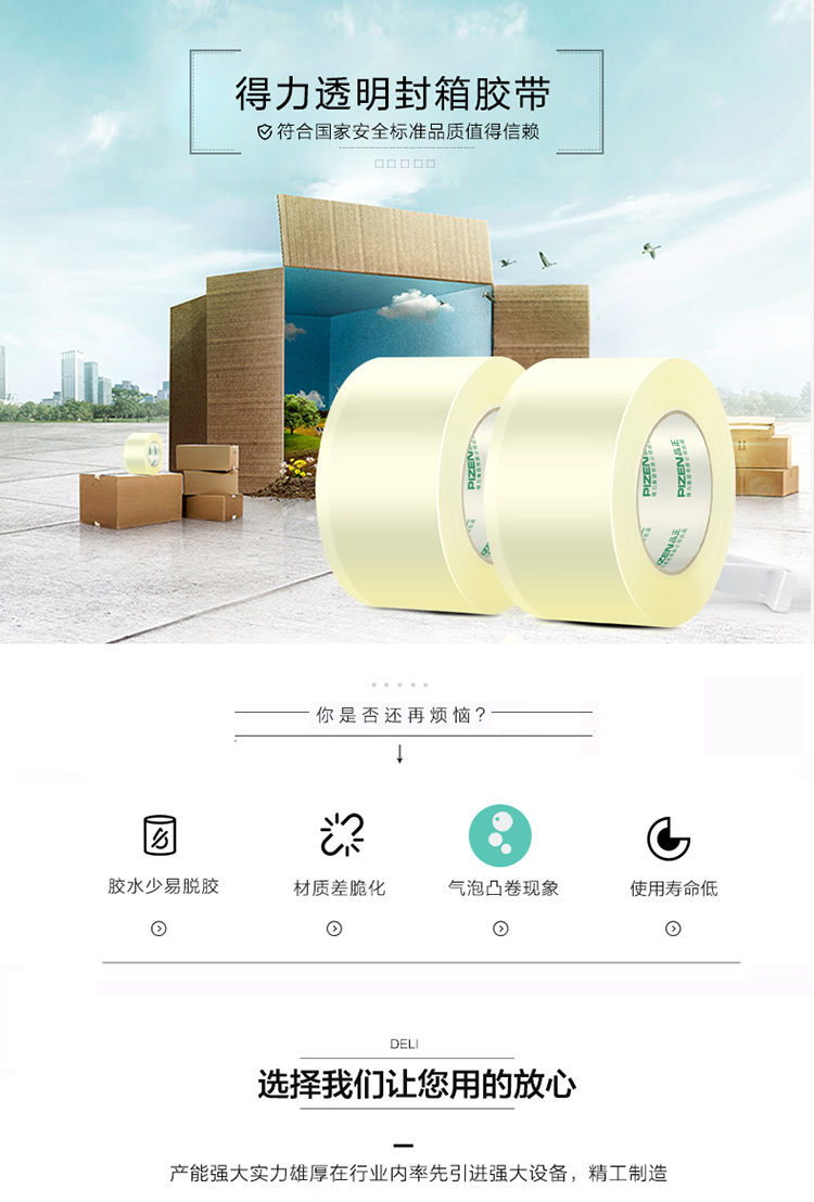 • 商品名稱:得力(deli)高品質(zhì)透明封箱膠帶/打包膠帶 60mm*150m*50um 6卷/筒 33027