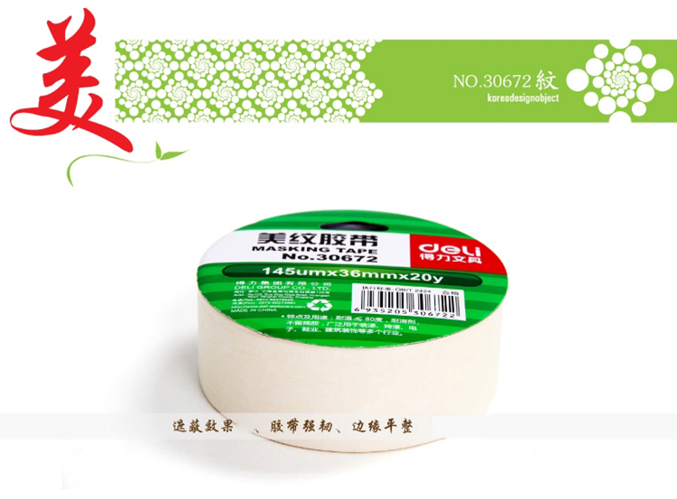 • 商品名稱:得力(deli)美紋紙膠帶/裝修遮蔽帶/無痕紙/貼膜 36mm*20y*145um(18.3m/卷) 1卷裝 30672