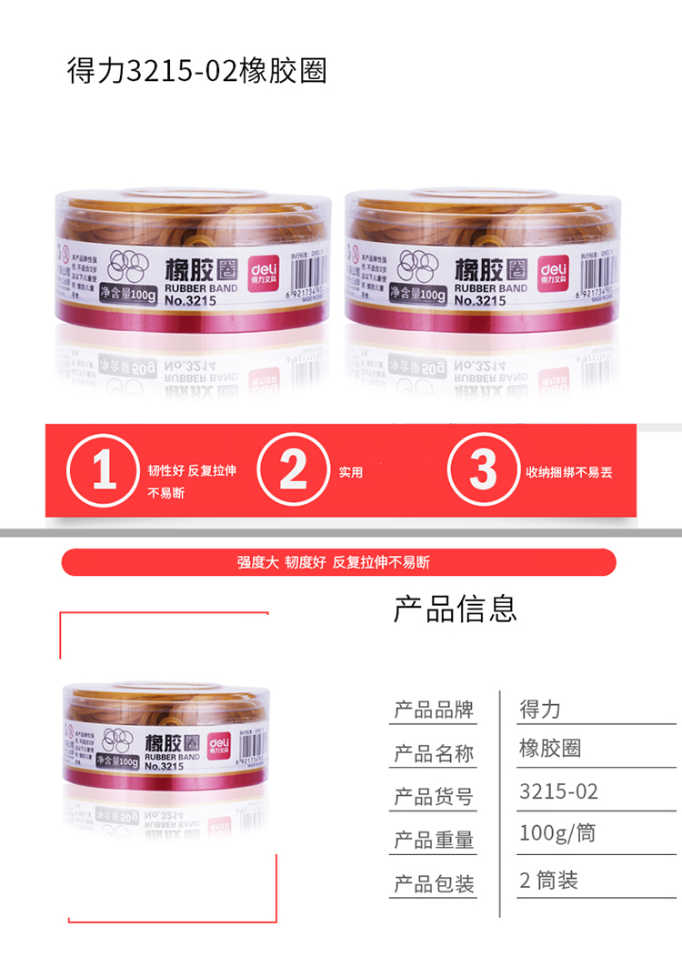 • 商品名稱:得力(deli)3215 2筒*100g裝高韌性高強度橡皮筋橡膠圈 100g/筒 反復(fù)拉伸不易斷