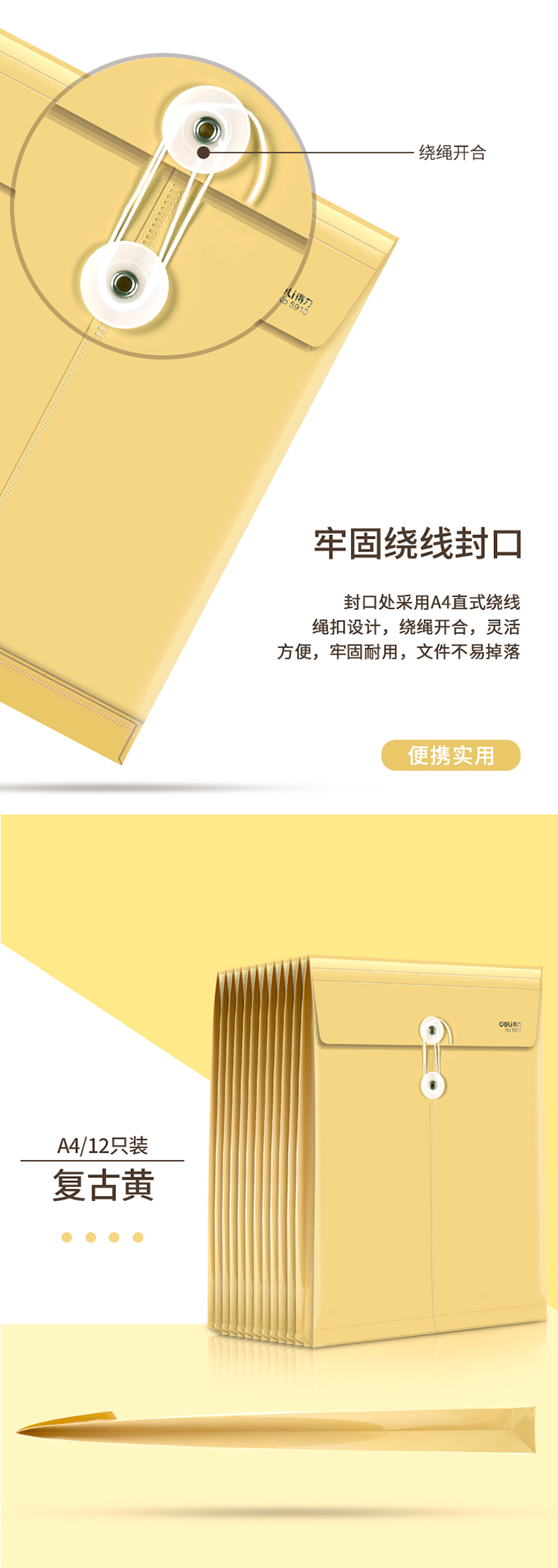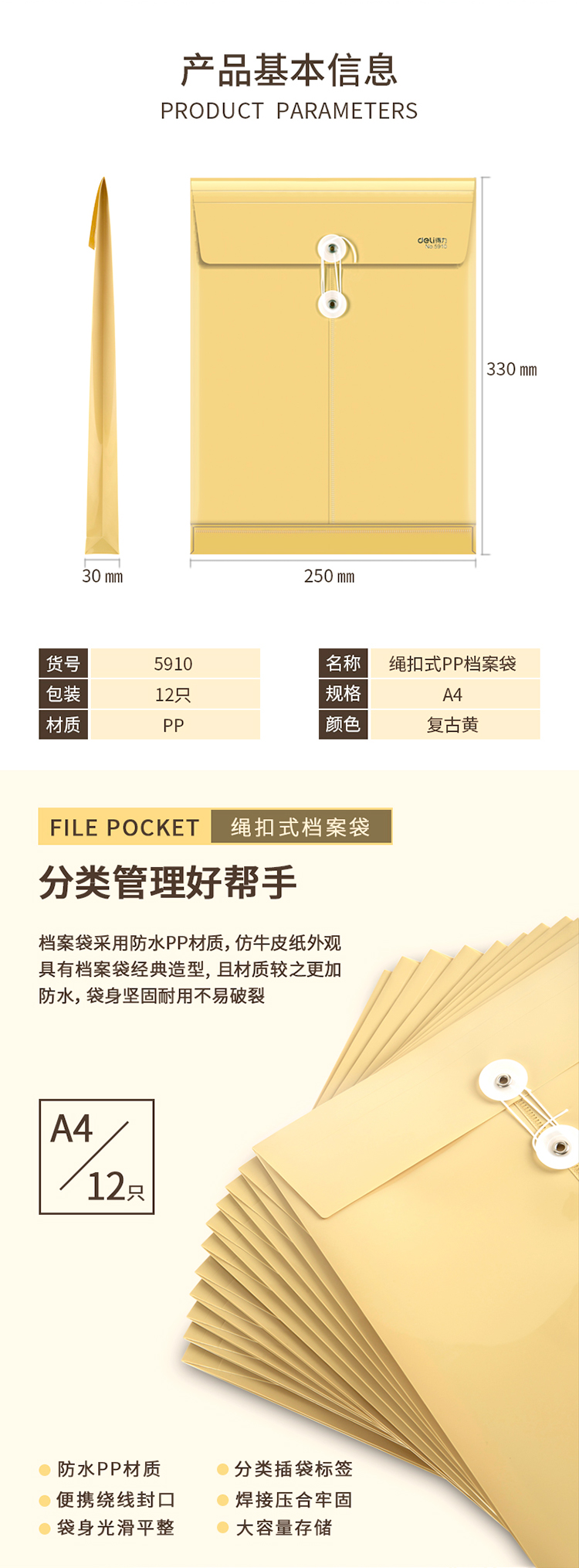 • 商品名稱:得力(deli)12只A4防水檔案袋 PP材質(zhì)耐折文件袋 復(fù)古黃5910
