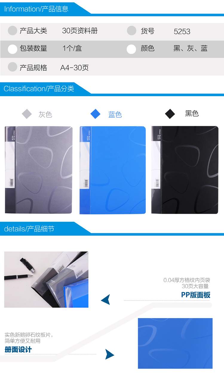 • 商品名稱:得力(deli)5253 A4/30頁資料冊/插袋文件冊/活頁文件夾 藍(lán)