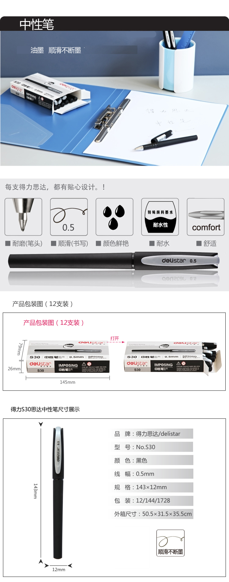 • 商品名稱:得力(deli)0.5mm黑色中性筆水筆簽字筆 磨砂桿12支/盒 S30