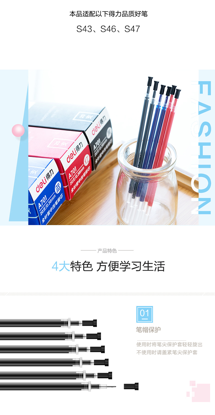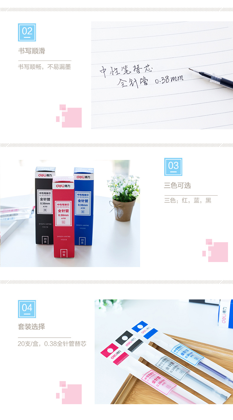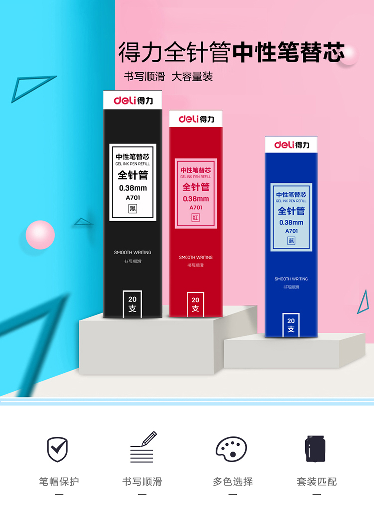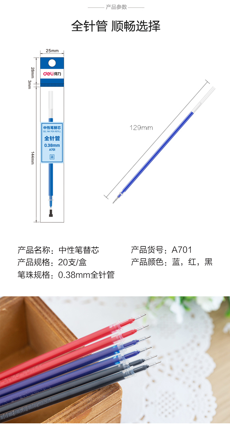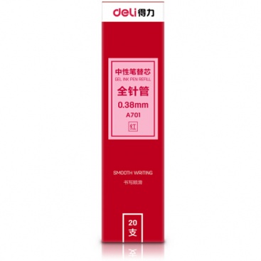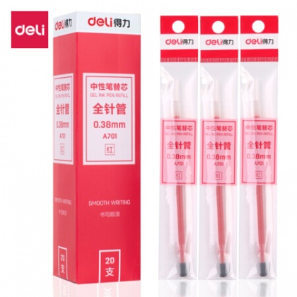 • 商品名稱:得力(deli)0.38mm全針管紅色中性筆筆芯 水筆簽字筆替芯20支/盒A701