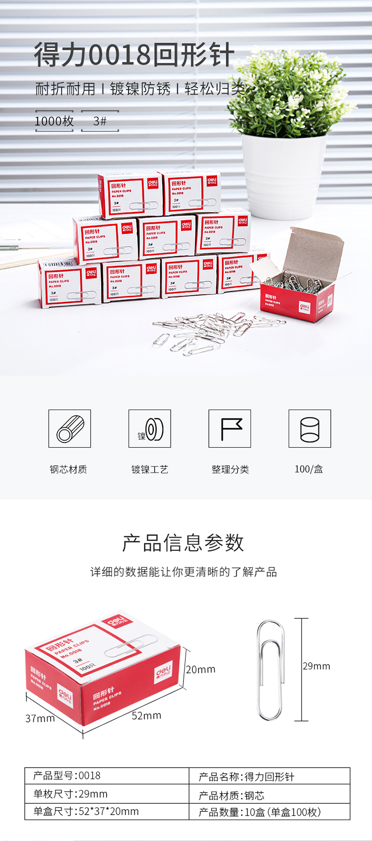 • 商品名稱:得力(deli)0018 回形針100枚/盒
