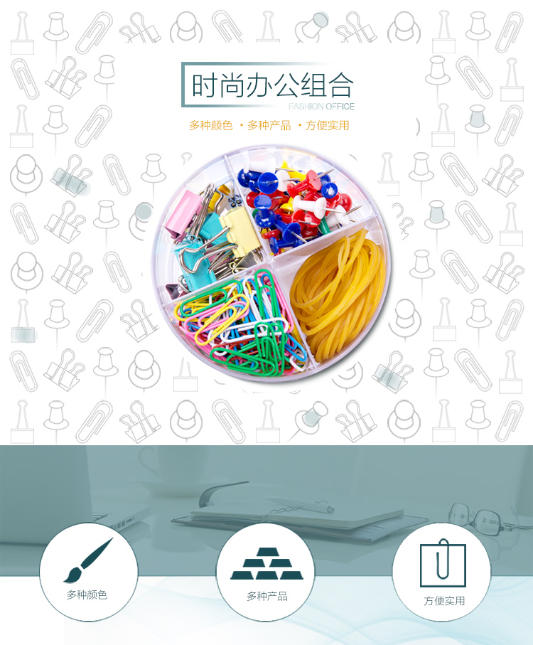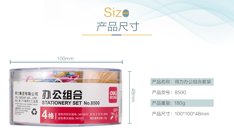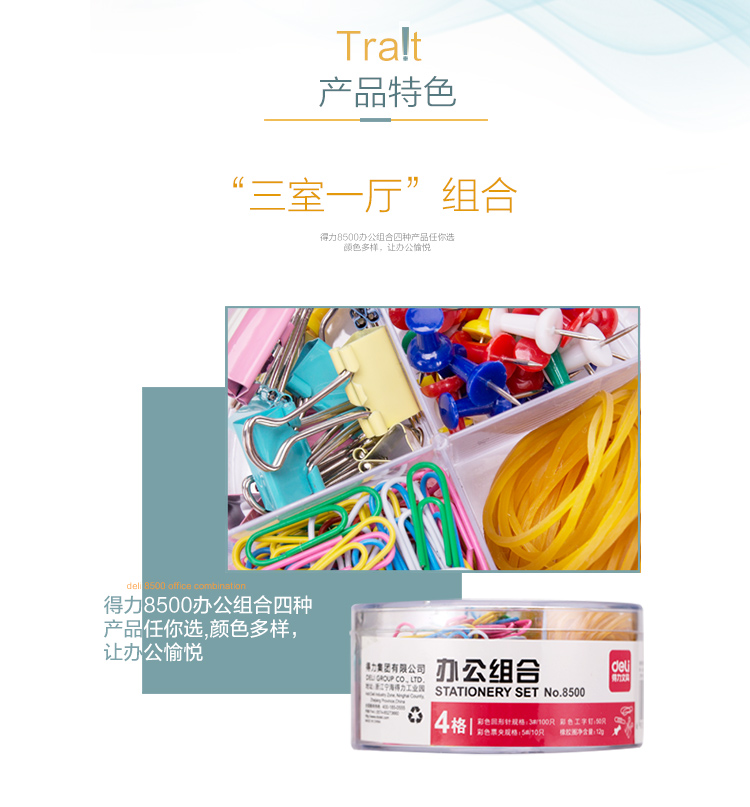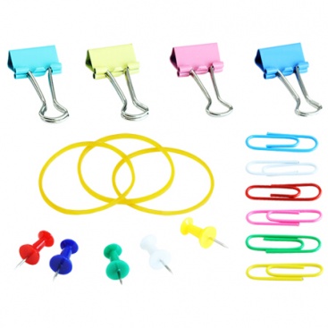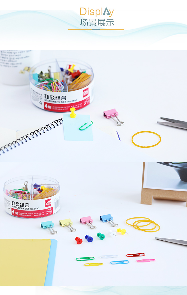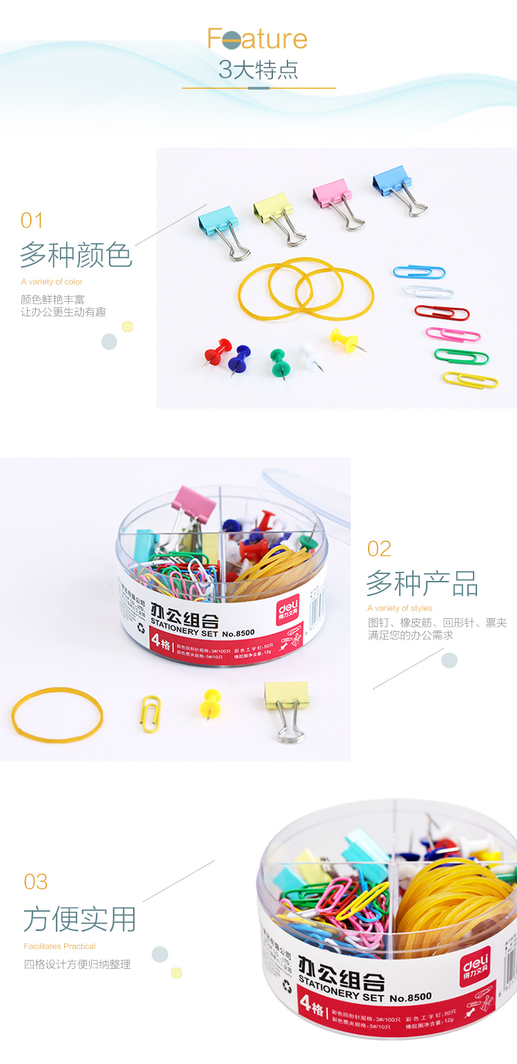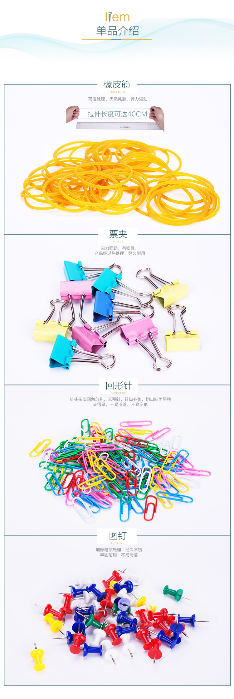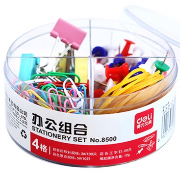 • 商品名稱:得力(deli)工字釘50只+回形針100只+票夾10只+橡皮筋四合一辦公組合套裝 8500