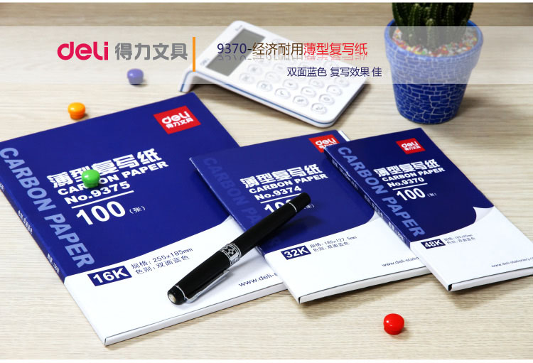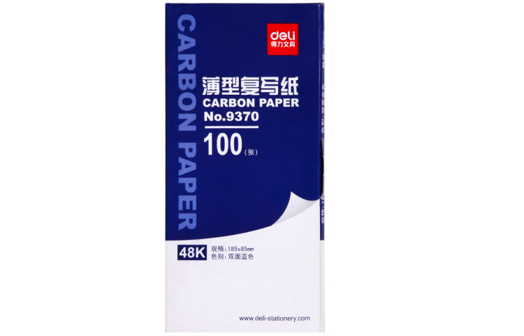 • 商品名稱:得力(deli)48K經(jīng)濟(jì)耐用薄型復(fù)寫(xiě)紙(18.5*8.5cm) 100張/盒 藍(lán) 9370
