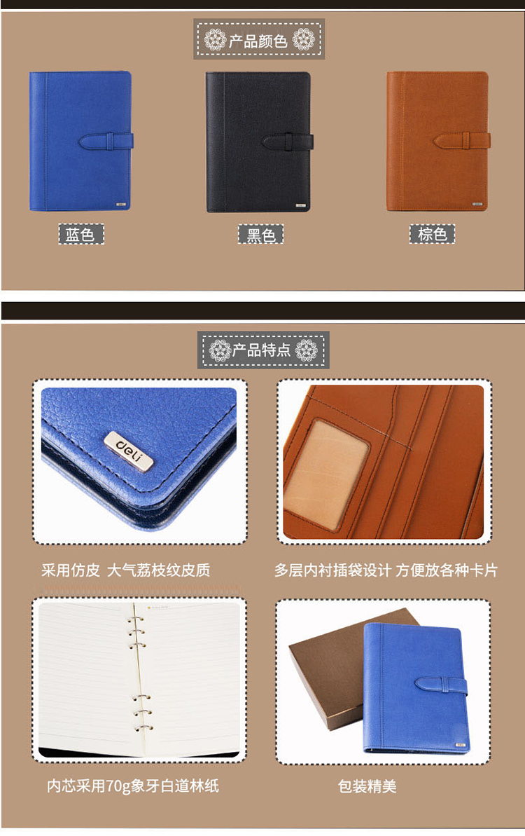• 商品名稱:得力(deli)25K100張高檔禮盒活頁(yè)皮面本 商務(wù)辦公記事本筆記本子 黑色3197