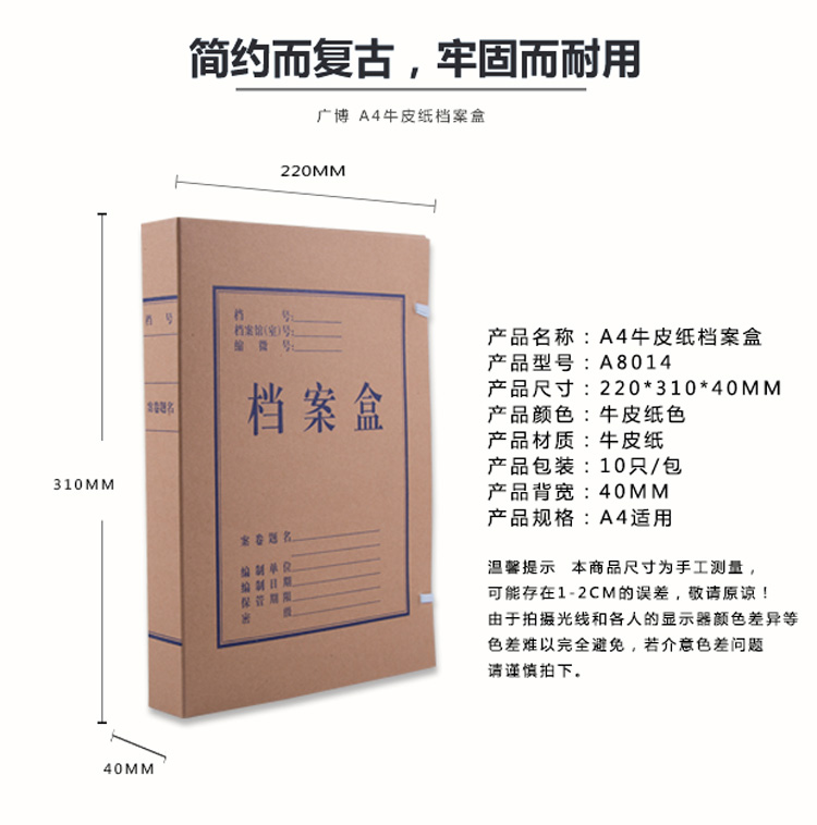 • 廣博(GuangBo)10個(gè)裝40mm經(jīng)典A4牛皮紙檔案盒/文件盒/文件收納A8018