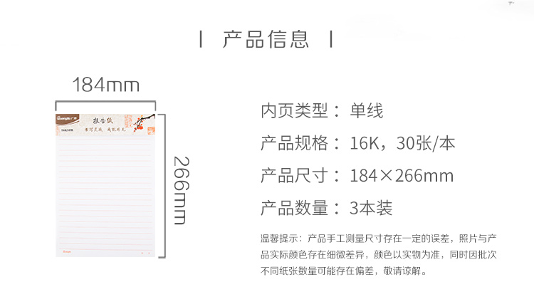 • 商品名稱:廣博(GuangBo)3本裝16K30張單線信紙本子草稿本文稿紙 GB16218