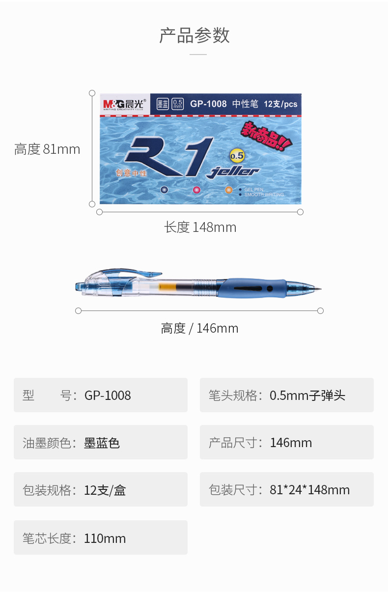 • 商品名稱:晨光(M&G)GP1008藍色0.5mm按動中性筆子彈頭中性筆簽字筆水筆 12支/盒