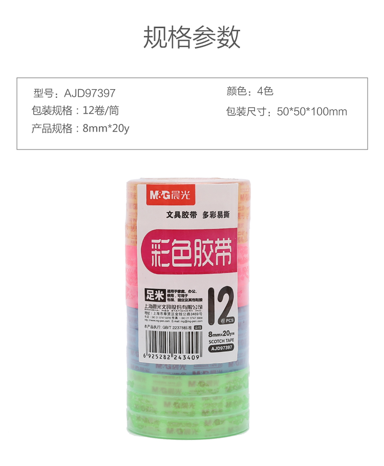 • 商品名稱:晨光(M&G)8mm*20y彩色手工易撕小膠帶 12卷裝AJD97397